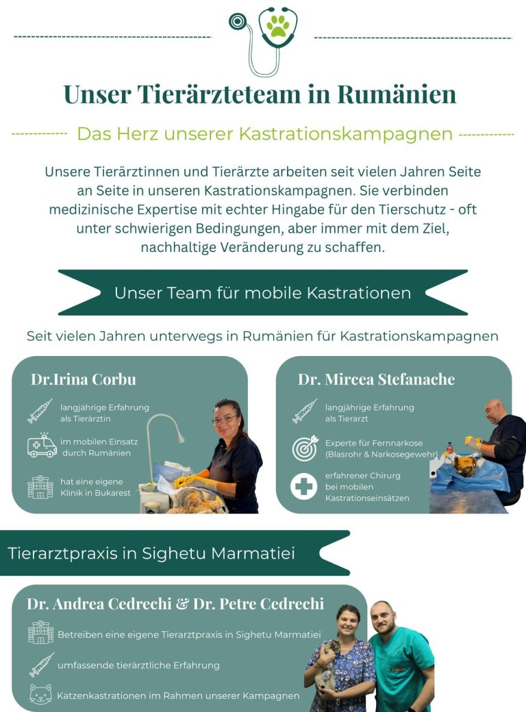Herzensangelegenheit Kastra e.V. ist ein noch junger, aber engagierter Verein, dessen Hauptaufgabe die Kastration und medizinische Versorgung von Straßen- und Besitzertieren ist. Unser Ziel ist es, weiteres Leid und eine Überpopulation zu mildern und diesen Kreislauf zu durchbrechen. Auch die Aufklärung der Bevölkerung gehört zu unseren Aufgaben. Besonders in Rumänien setzen wir uns dafür ein, durch Kastration Leid zu verhindern. Wir arbeiten eng mit Dr. Irina Corbu aus Bukarest sowie Dr. Andreea Cedrechi und Dr. Petre Cedrechi aus Sighetu Marmației zusammen. Unsere Partner sind auf minimal-invasive Kastrationen spezialisiert und bringen umfangreiche Erfahrung mit.